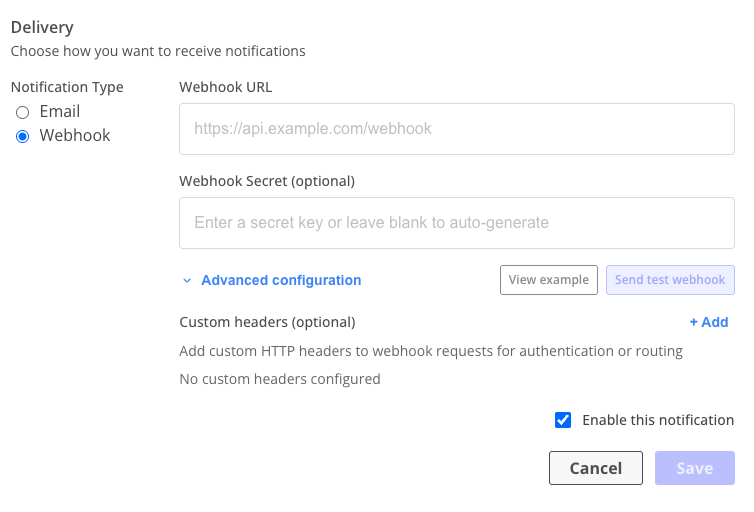 3. (Optional) Expand Advanced configuration to add custom HTTP headers for authenticating with your endpoint (for example, Authorization: Bearer token). For more information, see About adding custom HTTP headers in Configure and test webhooks (Beta).