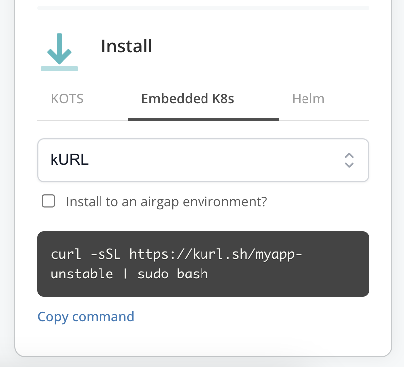 For information about getting installation commands with the Replicated CLI, see channel inspect. For information about getting installation commands with the Vendor API v3, see Get install commands for a specific channel release in the Vendor API v3 documentation.